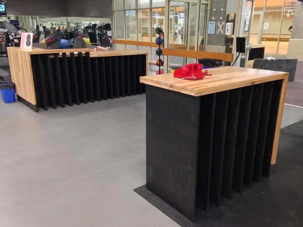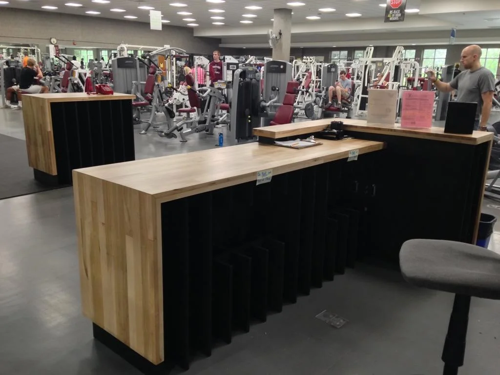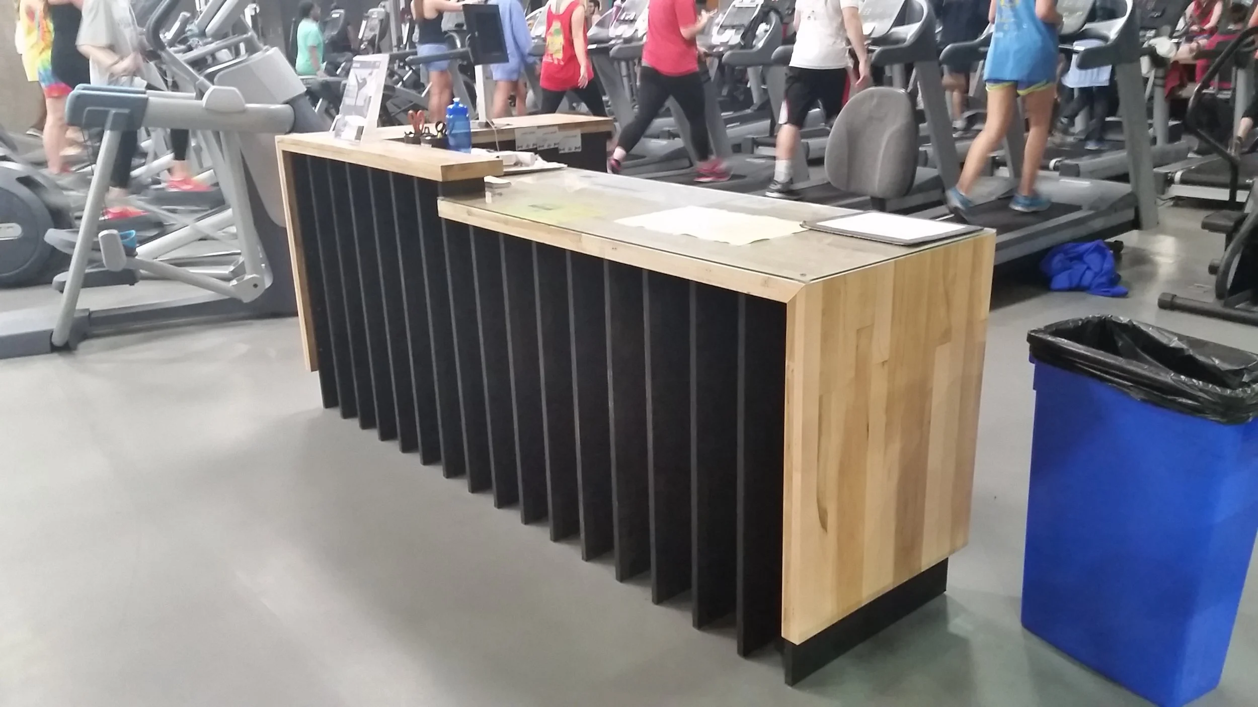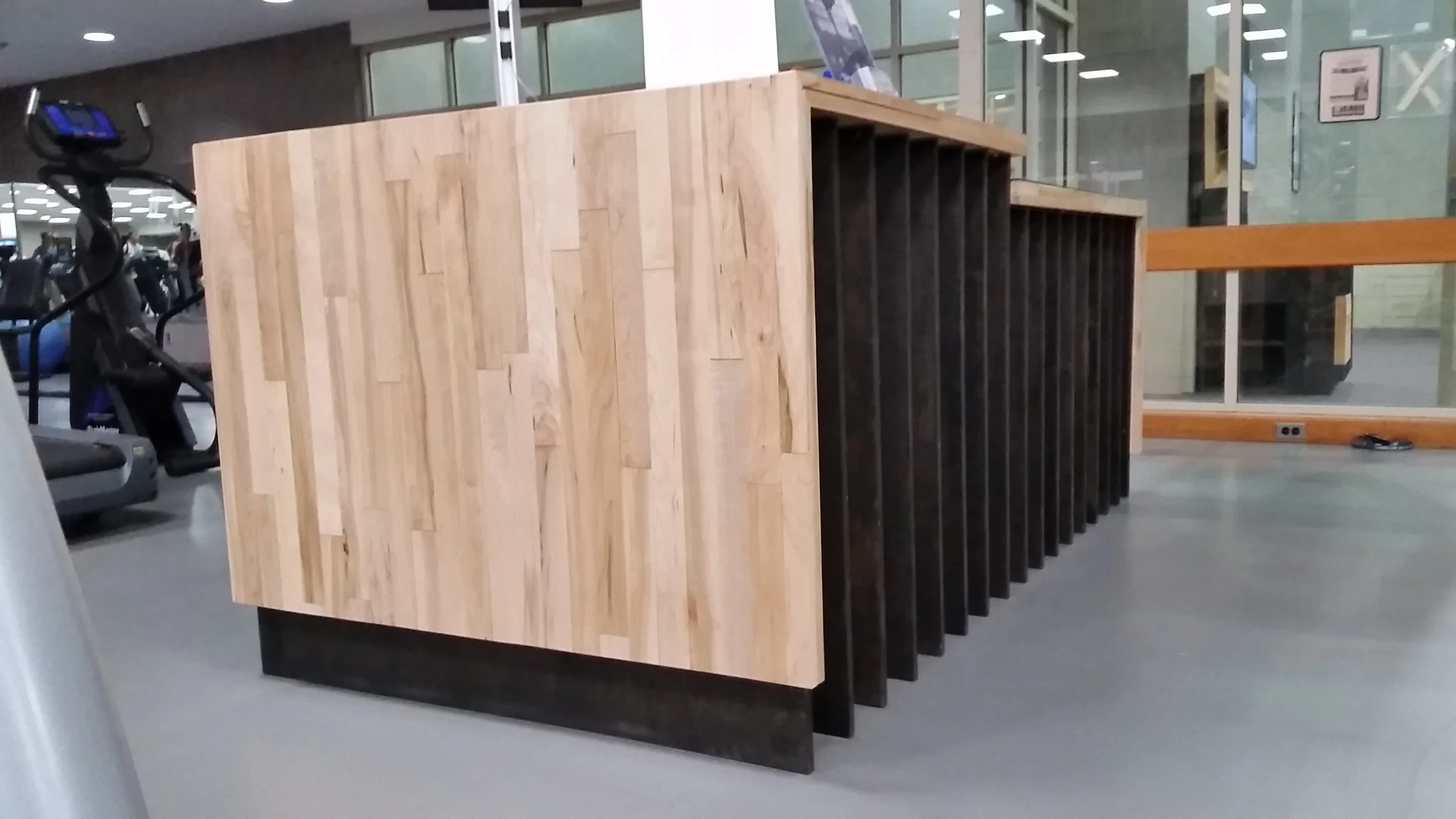 Alpha Rho Chi communicated with the Mississippi State Gymnasium and received the opportunity to design and build a reception desk for their weight room. Given the constraints and deadline the clientele wanted, we came up with a design that incorporated weight lifting bars for structural support and to tie everything together as well as using the old basketball court floor to create a waterfall counter top. Evenly spaced slits give enough room for storage as well as kick space for customers.