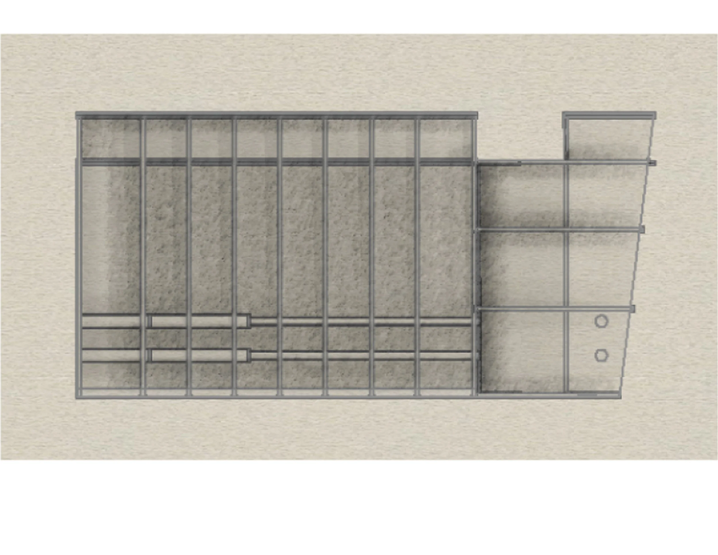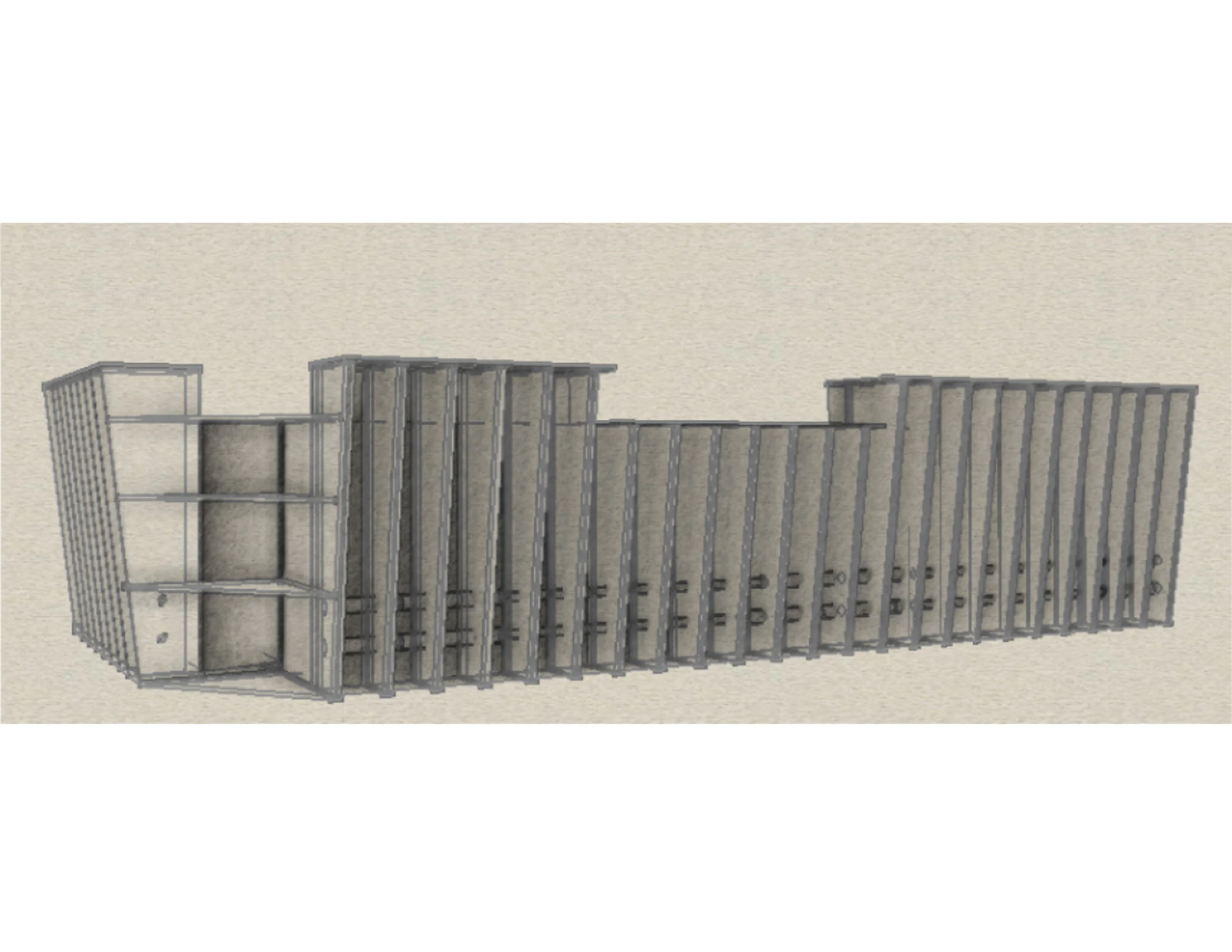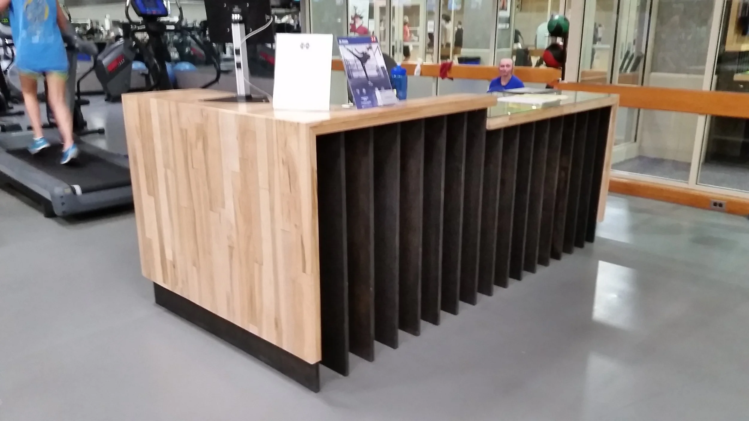 Alpha Rho Chi communicated with the Mississippi State Gymnasium and received the opportunity to design and build a reception desk for their weight room. Given the constraints and deadline the clientele wanted, we came up with a design that incorporated weight lifting bars for structural support and to tie everything together as well as using the old basketball court floor to create a waterfall counter top. Evenly spaced slits give enough room for storage as well as kick space for customers.